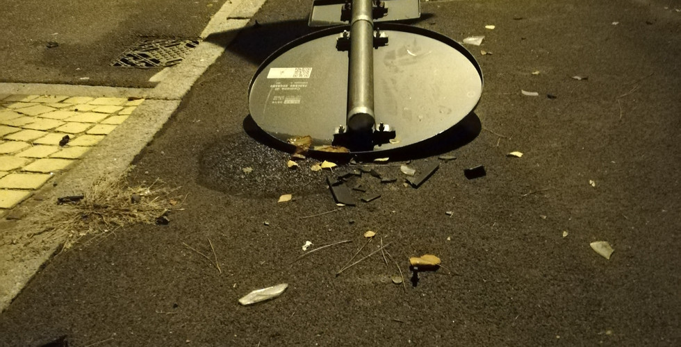 Sul marciapiede, affianco al palo distrutto, molti rimasugli di una macchina di colore blu scuro. Vedendo l’inclinazione del palo, la causa dell’incidente dovrebbe essere riconducibile all’eccesso di velocità e una volta intrapreso il dosso bagnato dalla pioggia del giorno precedente, ha perso il controllo del veicolo fino a impattarsi contro il paletto di protezione del marciapiede e il cartello della segnaletica sul marciapiede.